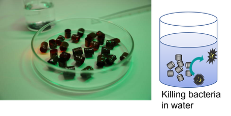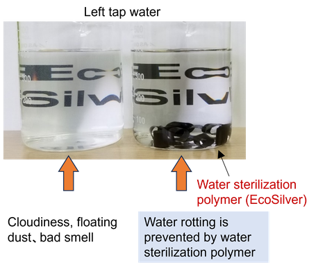 It swells in water, making a formation easy to catch bacteria with the polymer molecule network. The caught bacteria is killed by the effect of the silver particle immobilized on the polymer.