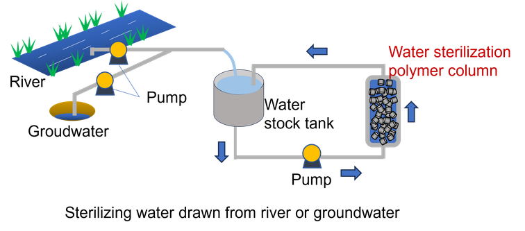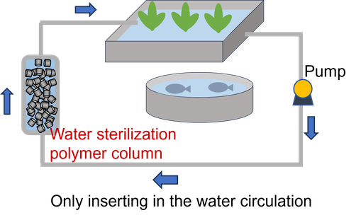 Applications of the original water sterilization polymer, unhazardous to the eco-system, to agriculture (hydroponics, plant factory, aquaponics), aquaculture and animal husbandry