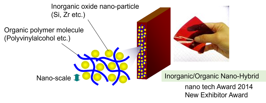 Inorganic oxide nano-particles and organic polymer molecules are chemically combined