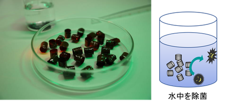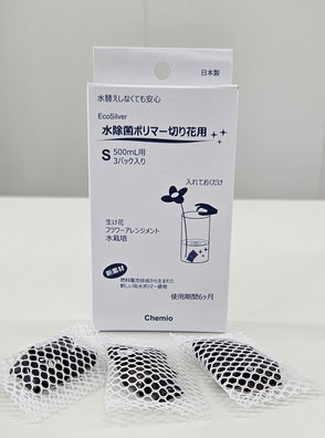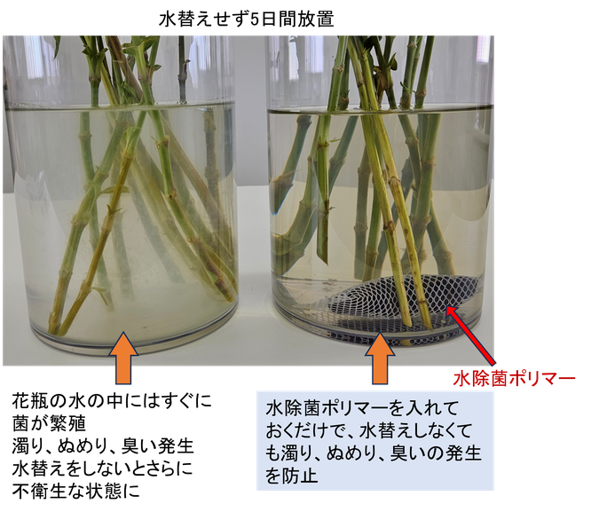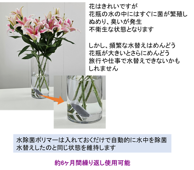 水除菌ポリマーは入れておくだけで自動的に水中を除菌し、水腐りを防止します