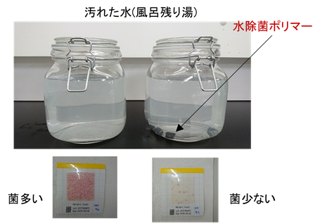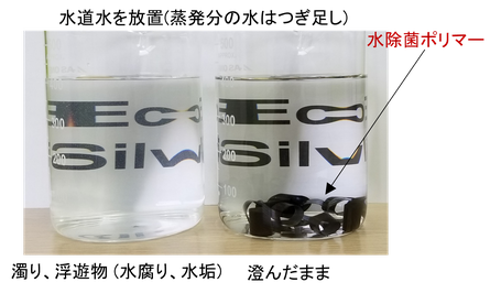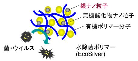 水に漬けると膨潤し、ポリマー分子のネットワークで菌を吸着しやすい状態になります。ポリマーに固定された銀の作用によって吸着された菌は死滅します。
